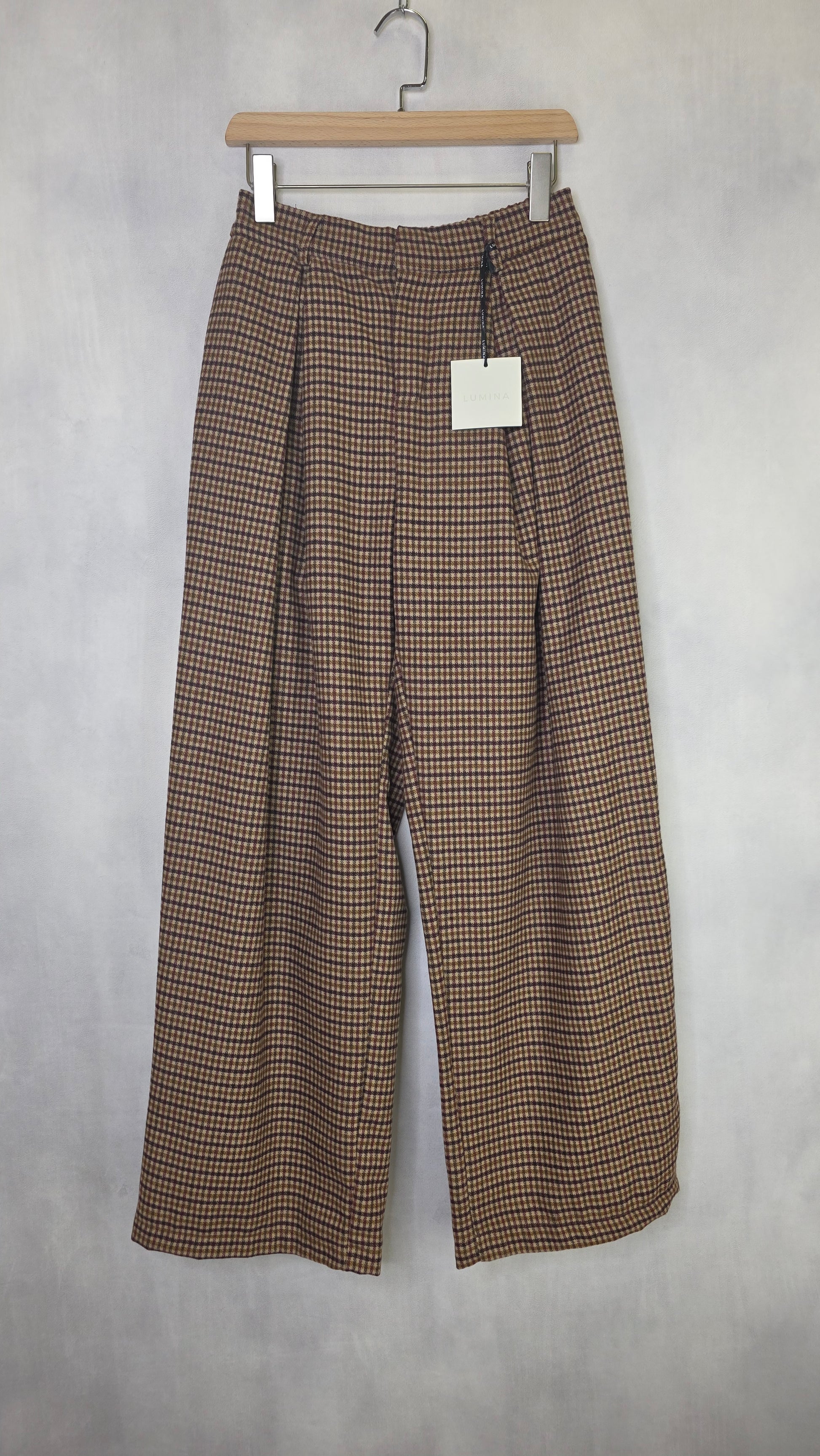 Pantalone realizzata in misto lana Presenta fantasia a quadretti Bottone in vita a scomparsa Pinces frontali Vita elastica sul retro Pantalone a Taglia